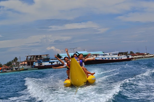 Setelah hunting sunrise, kami lanjut ke agenda terahir sebelum kembali ke bogor! Banana Boat!!! Yeay!!! Untuk acara yang satu ini lumayan ngeselin sebenernya. Kita harus mengantri dan berbagi dari rombongan trip lain. Secara banana boat disini cuma ada sebijik! Hufh -__-