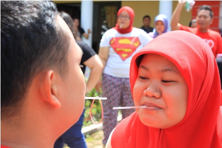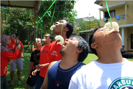 Acara sarapan bersama pun di mulai, dari malam sebelumnya sampai pagi hari, Mba Ika dan Mas Icang masih menjadi Chef andalan kami. Mulai ayam bakar, mie goreng setan, capcay, dll rasanya juwara! Nom nom nom. Selesai sarapan, acara kami lanjutkan dengan games. Mulai dari games karet gelang, makan kerupuk, sampai balap karung. Tidak ada malu siang itu, semua berpartisipasi dan teramat seru. Pun demikian saat Mas Ariy dengan gantengnya menggelinding saat jatuh dengan karungnya, bibir Bude Retno yang monyong dengan cantik saat harus mengaitkan karet gelang dengan sedotan, atau betapa rakusnya Mas Bani saat lomba makan krupuk dengan sekali caplok. :p